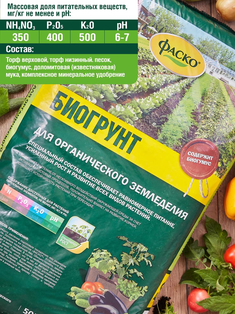 Питательные элементы: Содержание доступных для растений питательных элементов (мг/кг) и рН:¶Азот – 300; Фосфор – 500; Калий – 600; pH – 6-7