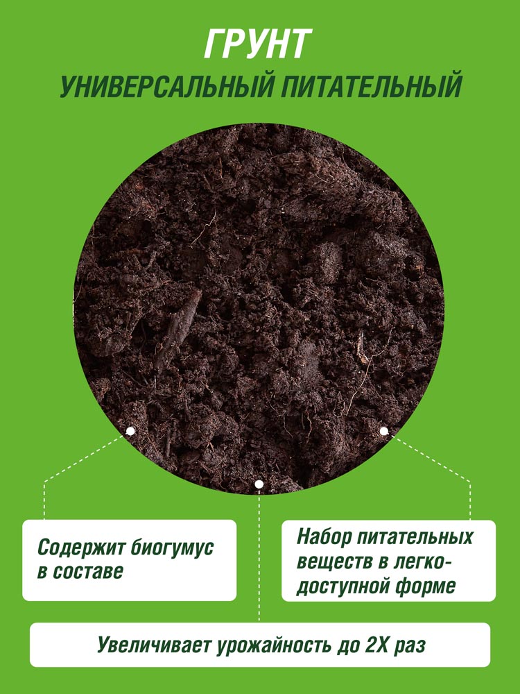 Торф верховой, торф низинный, песок, биогумус, доломитовая (известняковая) мука, комплексное минеральное удобрение