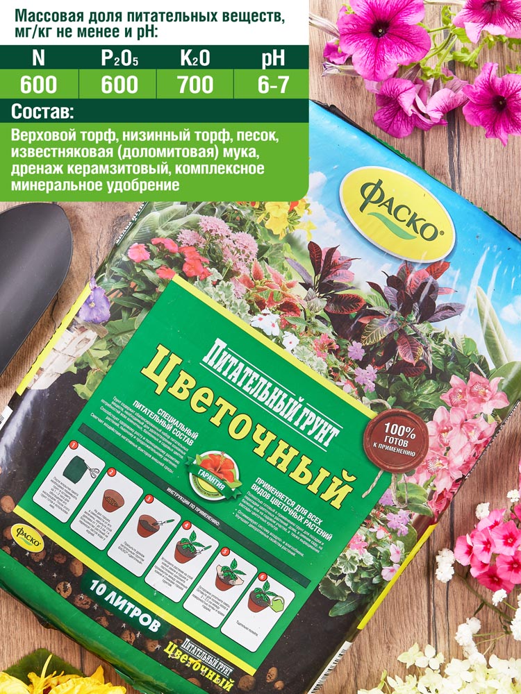 Питательные элементы: Азот - 600 мг/кг; Фосфор - 1000 мг/кг; Калий - 700 мг/кг; марганец - 70 мг/кг; железо - 30 мг/кг; медь - 6 мг/кг; цинк - 5 мг/кг; бор - 1; гуматы – 1; pH 6-7.