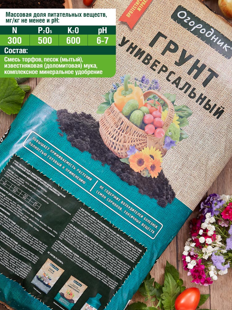 Питательные элементы: | Азот – 400мг/кг; Фосфор - 1000 мг/кг; Калий - 600 мг/кг; pH 6-7 |