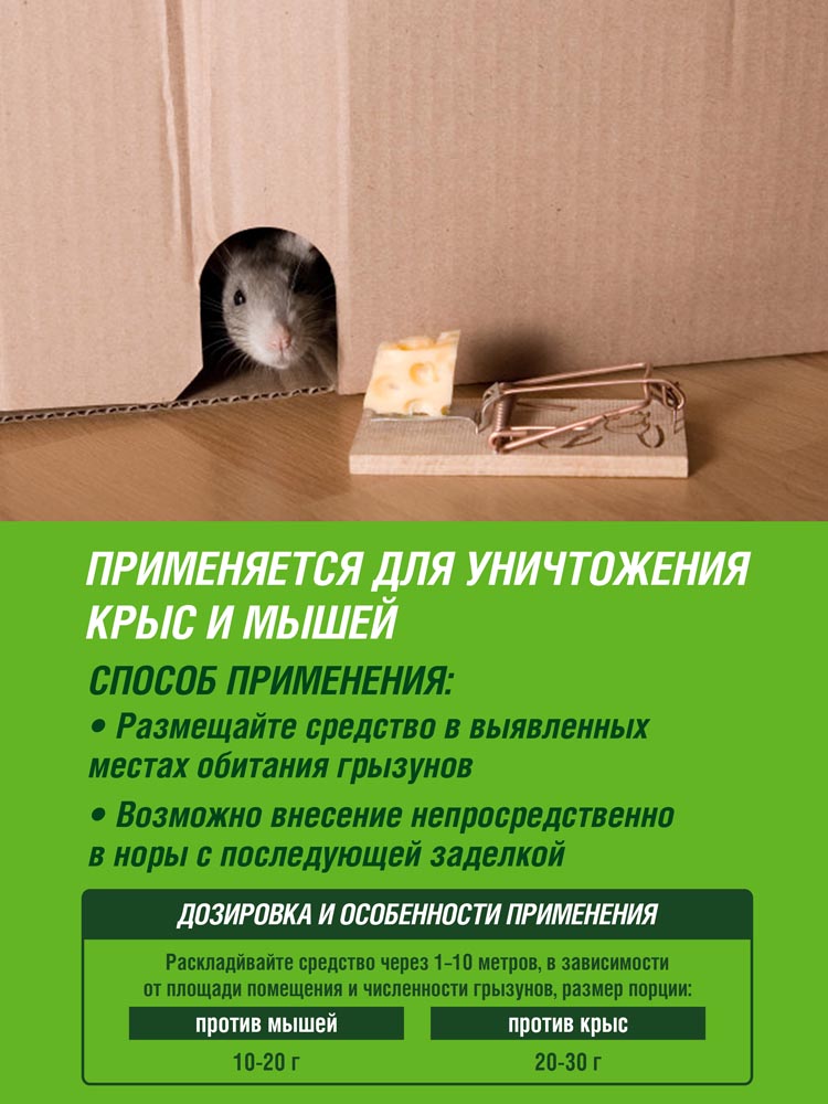 Гранулированная приманка для уничтожения крыс и мышей.100% гибель крыс и мышей через 4-10 дней после поедания
