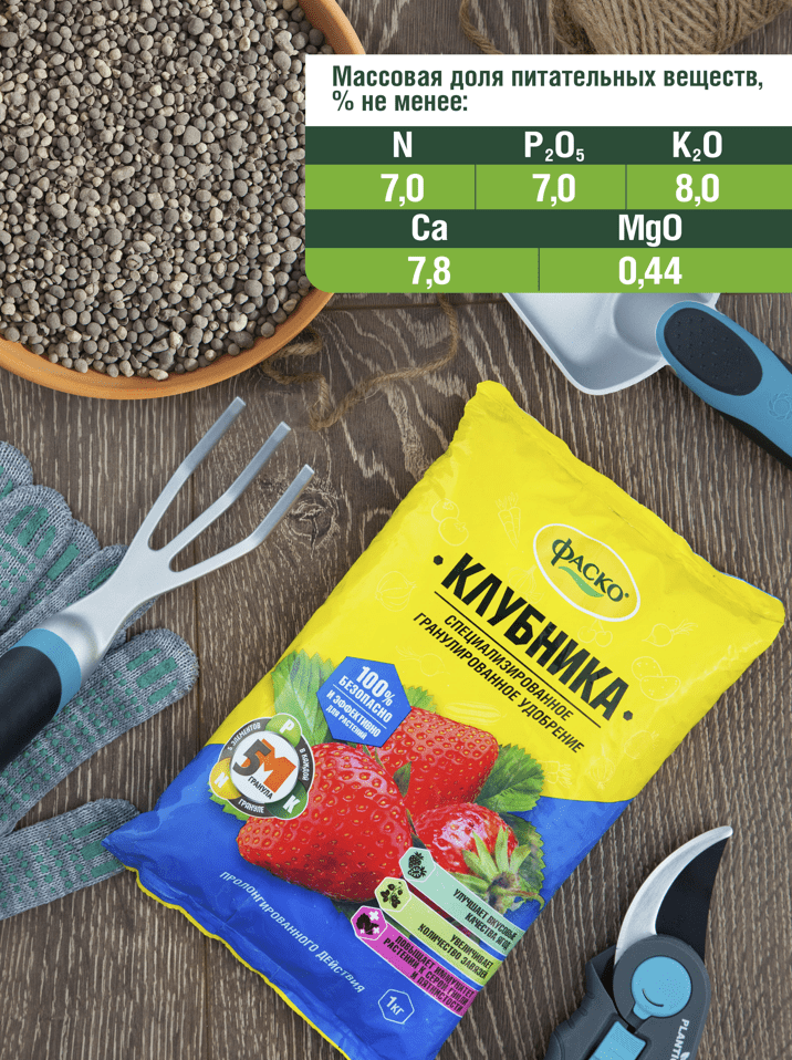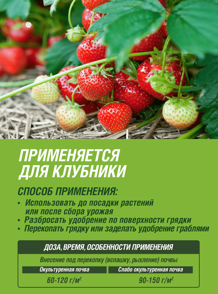 Применяется при посадке и подкормке клубники, земляники и малины весной и осенью.
