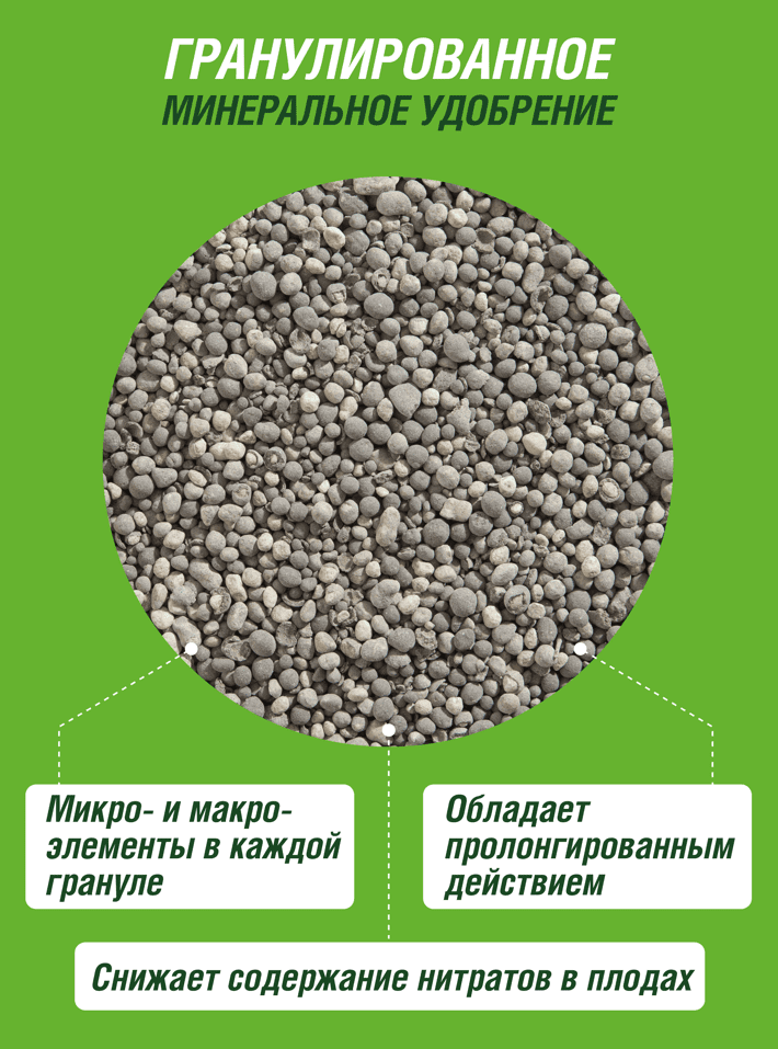 Пролонгированное действие – гранулы постепенно растворяются в почве, обеспечивая растение питательными веществами в течении всего сезона при однократном внесении.
