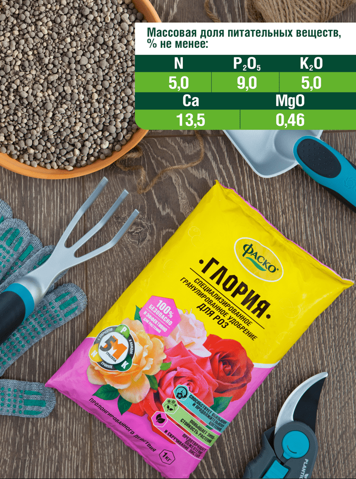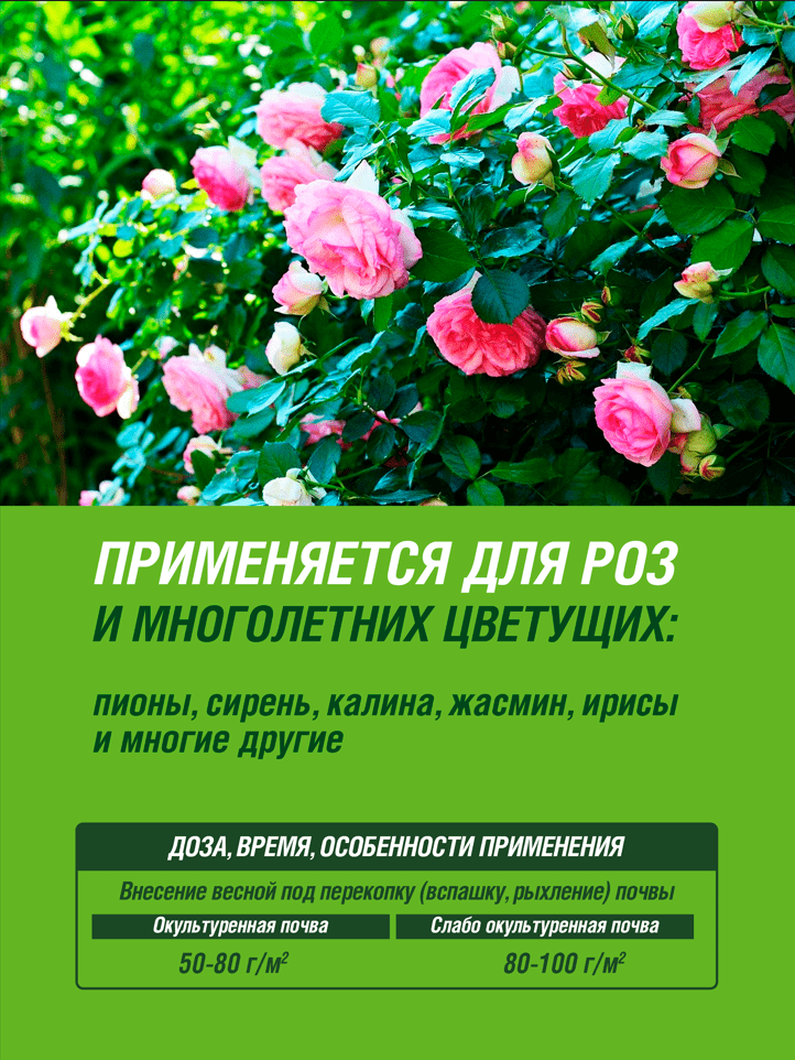 Применяется для всех видов роз (садовые, балконные, парковые) и других многолетних цветущих растений (пионов, хризантем, сирени, жасмина и т.д.)