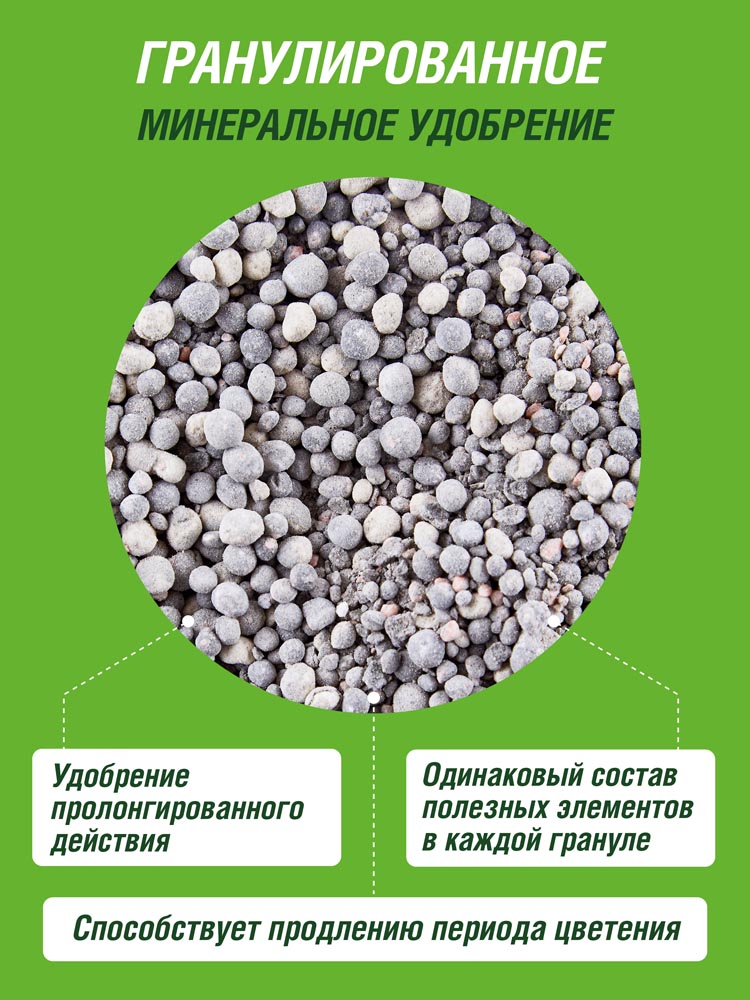 Всё в одной грануле - каждая гранула удобрения содержит макро- и микроэлементы в оптимальных для растения пропорциях.