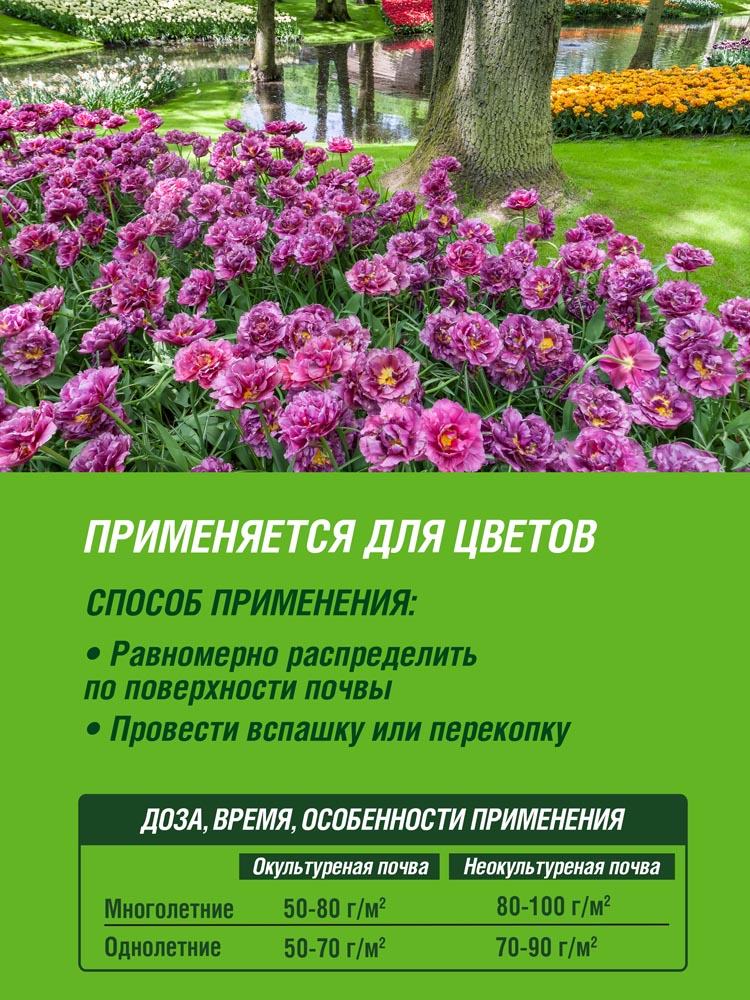Применяется для подкормки однолетних и многолетних цветочно-