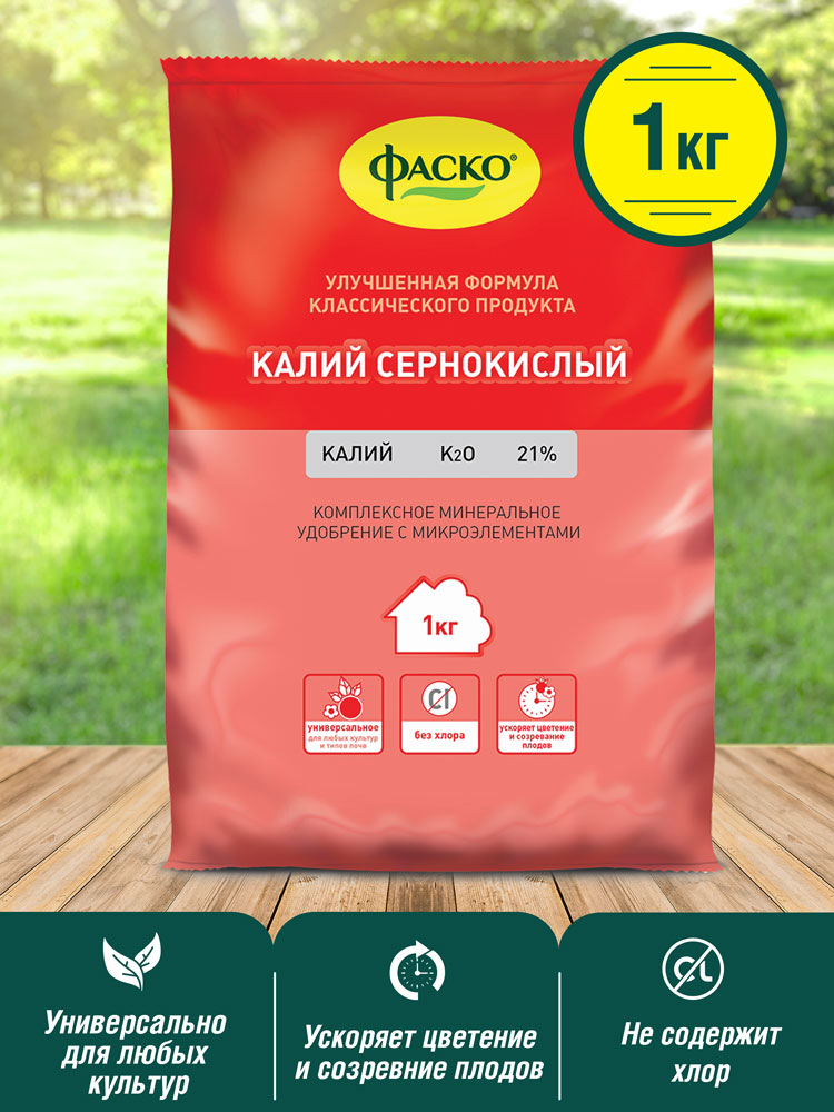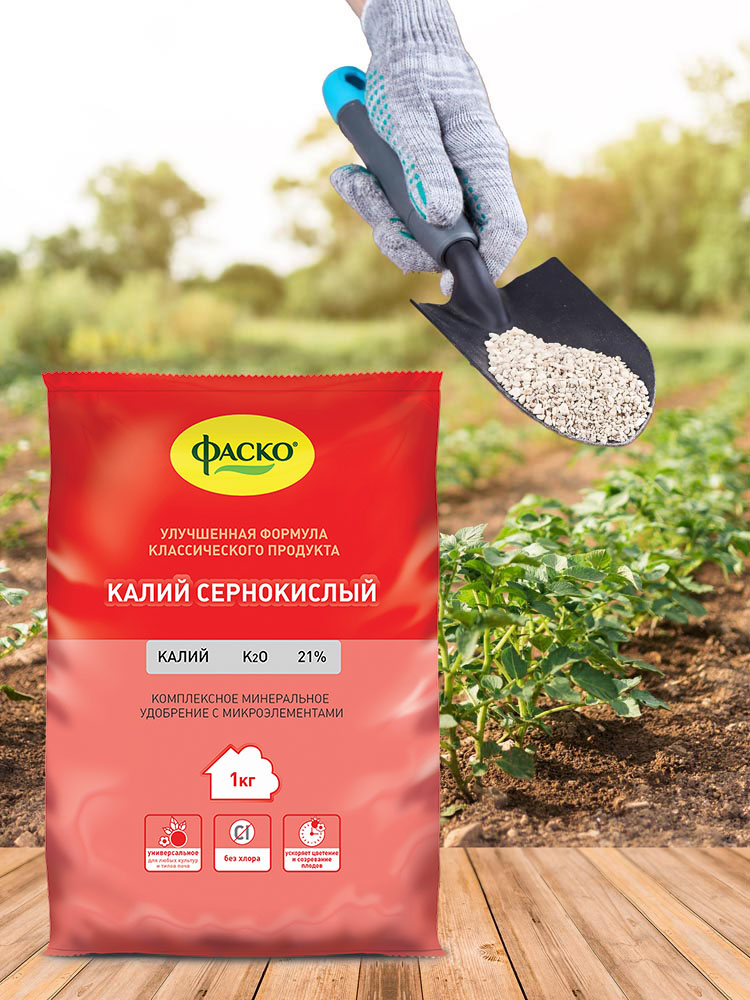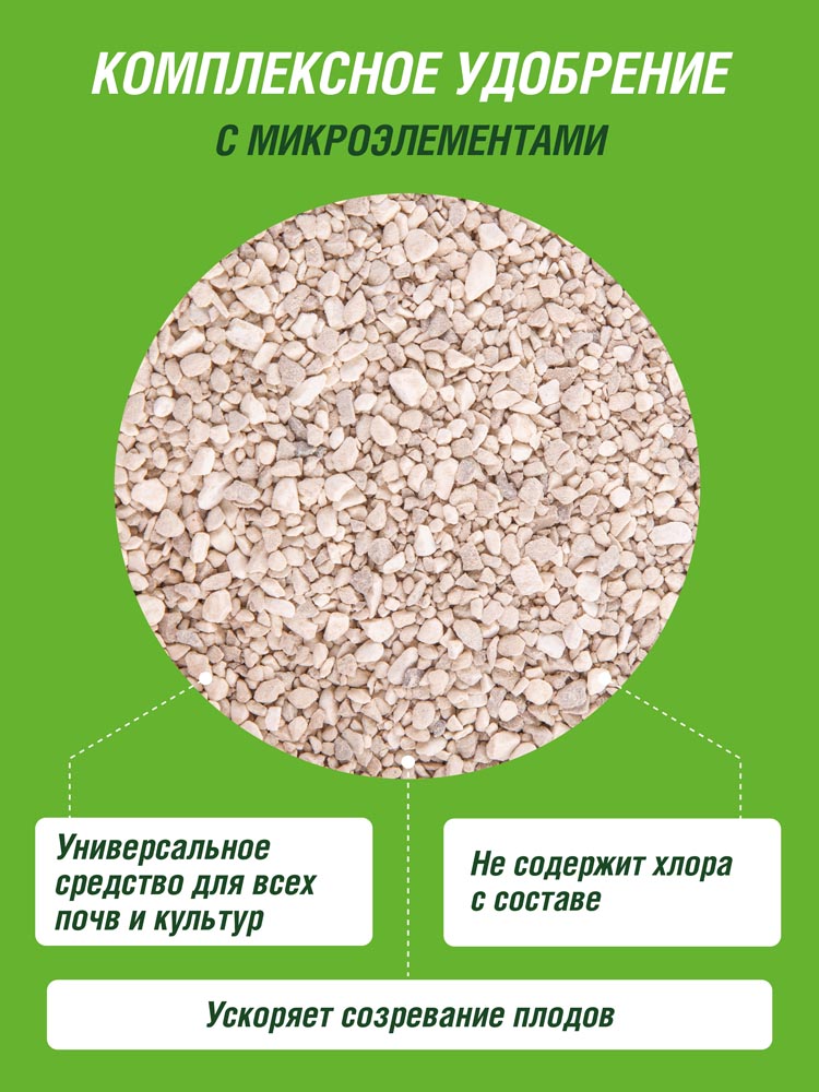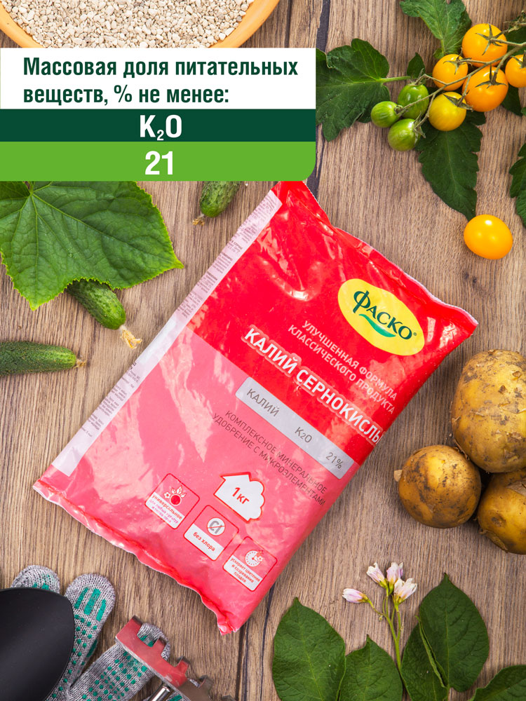 | Питательные элементы: | Калий > 21%, Марганец > 0,06%, Бор > 0,02%, Медь > 0,01%, Цинк > 0,02%, Железо > 0,1% |