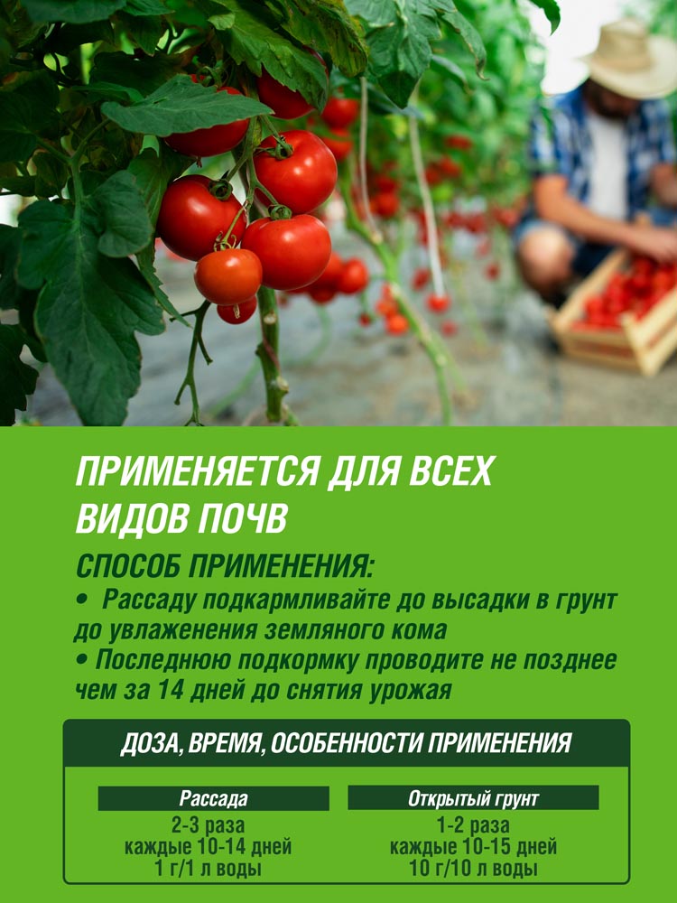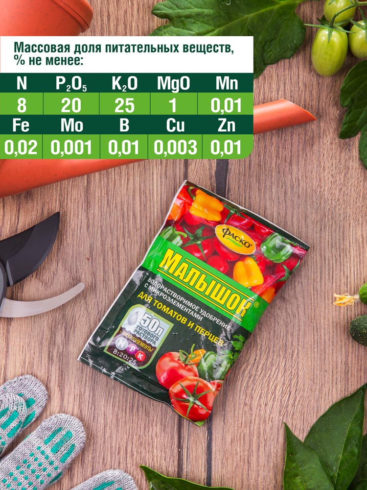 Питательные элементы: Массовая доля питательных веществ (элементов питания), % не менее: азот - 8; фосфор - 20; калий - 25; магний - 1; бор - 0,01; молибден - 0,001; медь - 0,003; марганец - 0,01; цинк - 0,01; железо - 0,02