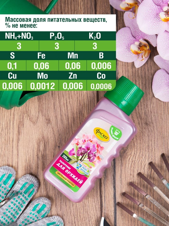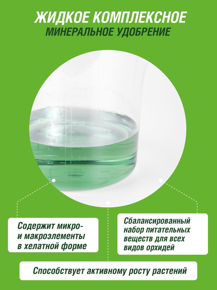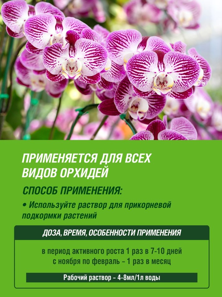Содержит сбалансированный набор питательных веществ необходимых для активного роста всех видов орхидей (фаленопсиса, каттлеи, цимбидиума, дендробилума, пафиопедилума) и других эпифитов.